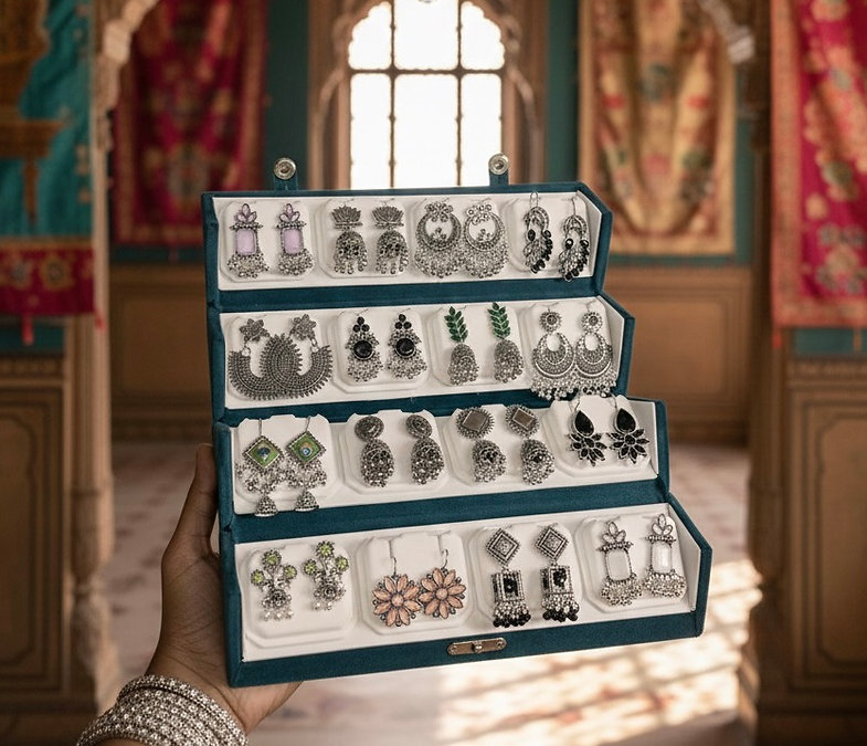 Upgrade your jewellery collection with this elegant 16 Pc Oxidised Jhumka Earrings Set, thoughtfully curated to offer variety, style, and traditional charm. Packed neatly in a premium black storage box, this set is perfect for both daily wear and special occasions.
