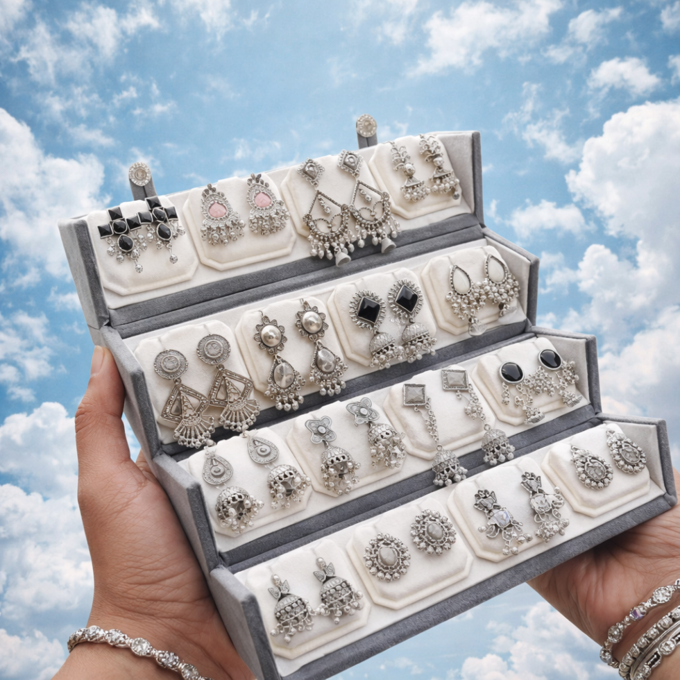 Upgrade your jewellery collection with this elegant 16 Pc Oxidised Jhumka Earrings Set, thoughtfully curated to offer variety, style, and traditional charm. Packed neatly in a premium black storage box, this set is perfect for both daily wear and special occasions.