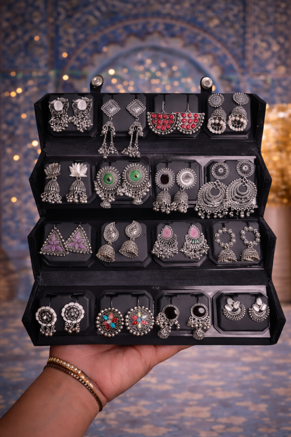 Upgrade your jewellery collection with this elegant 16 Pc Oxidised Jhumka Earrings Set, thoughtfully curated to offer variety, style, and traditional charm. Packed neatly in a premium black storage box, this set is perfect for both daily wear and special occasions.