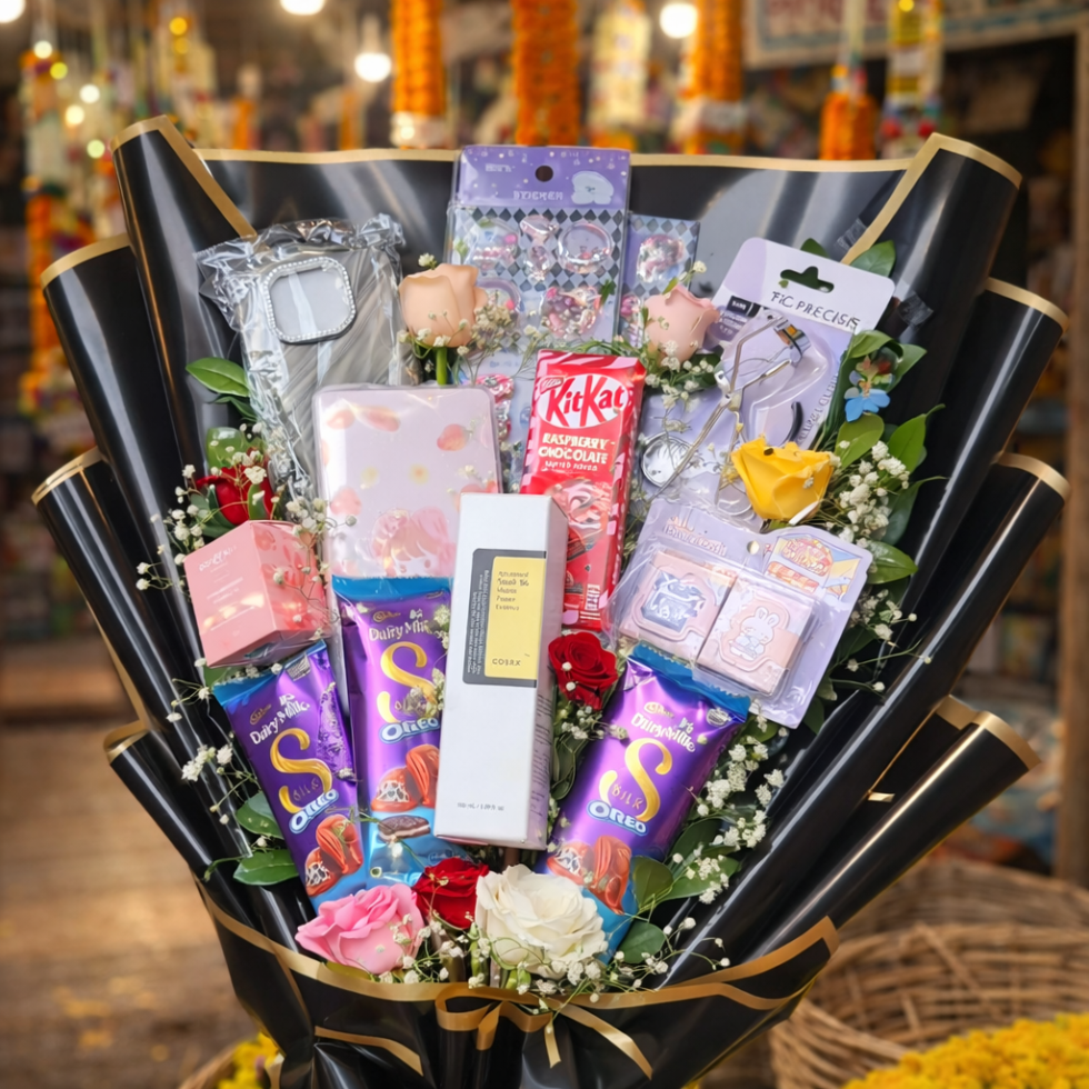 This unique bouquet includes a mix of chocolates, cute gifts, accessories, and fresh floral elements, all arranged in a stunning bouquet style. The premium presentation makes it completely ready to gift — no extra wrapping required.
