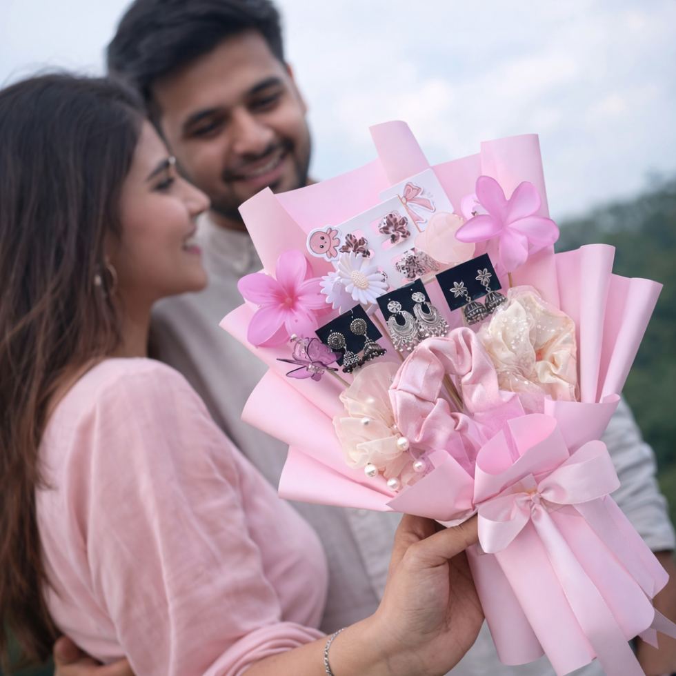 This charming hamper includes a mix of stylish earrings, soft scrunchies, and aesthetic accessories, arranged in an elegant bouquet style. The premium presentation makes it completely ready to gift — no extra wrapping required.